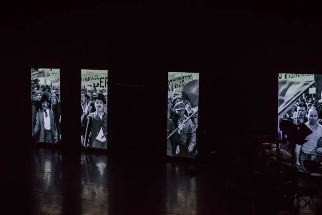 In 1984, it’s OK! by Jennifer Walshe (Dublin, °1974), the stage is dominated by a huge projection screen and a giant bass amplifier. Under the all-seeing eye of the camera, the musicians are required not only to play their instruments, but also run, jump and fight.