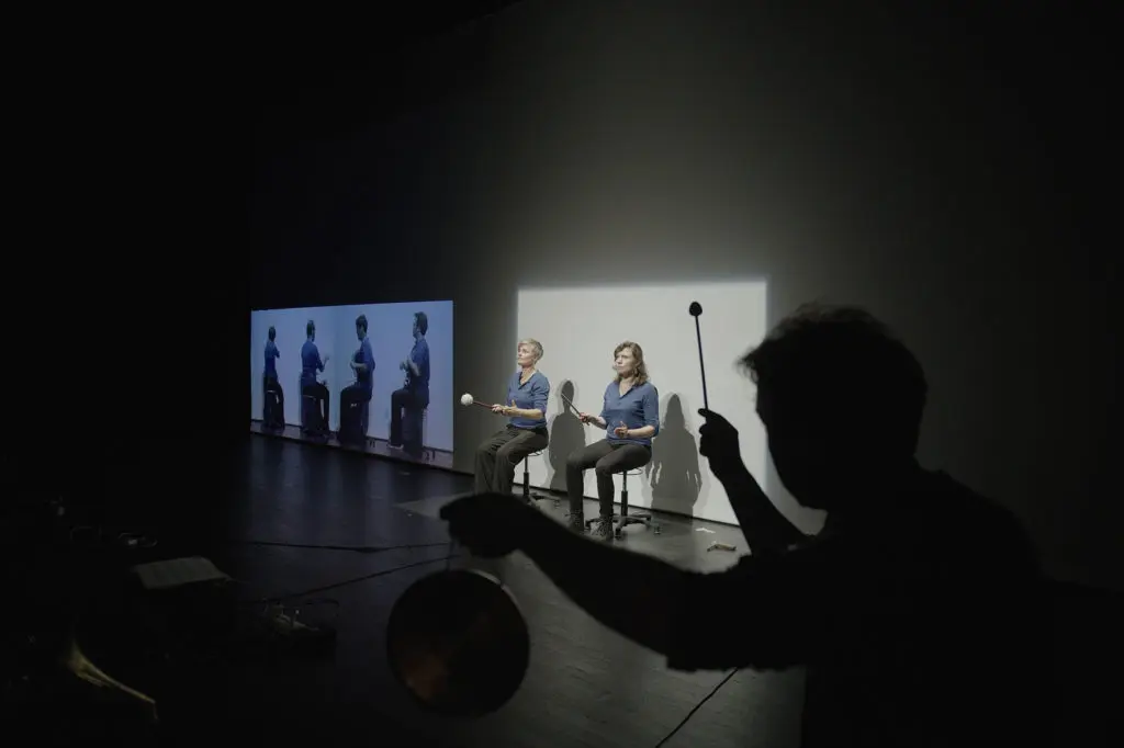 exit to enter is the high point in a series of compositions with live video, and the end point with regard to possible density in the use of written-out live video. A listener who thinks she already sees all the connections on first hearing is missing the mark. This is usually the case with music, although we don’t normally realize it. You can tell very clearly in exit to enter, perhaps because you see and hear everything at the same time, or because you might see something but not hear it. Sometimes this is something quite obvious. For example, during a concert, the musicians come onstage (enter), go offstage (exit), make movements while playing (and while not playing) and they usually have instruments in their hands. When listening to exit to enter, we concentrate on these things so as not to lose the thread. These things become the content, or in more old-fashioned terms, the material. The question of the identity of what is seen and heard plays a part in exit to enter as well. And of course the associated insecurity, which has been discussed in the media and in personal communications for some time now, is a sign of our times that also emerges here. The same goes for the question of the origins of music. It’s actually not clear whether the music is by me; it’s only clear here and there that it isn’t. (MB)